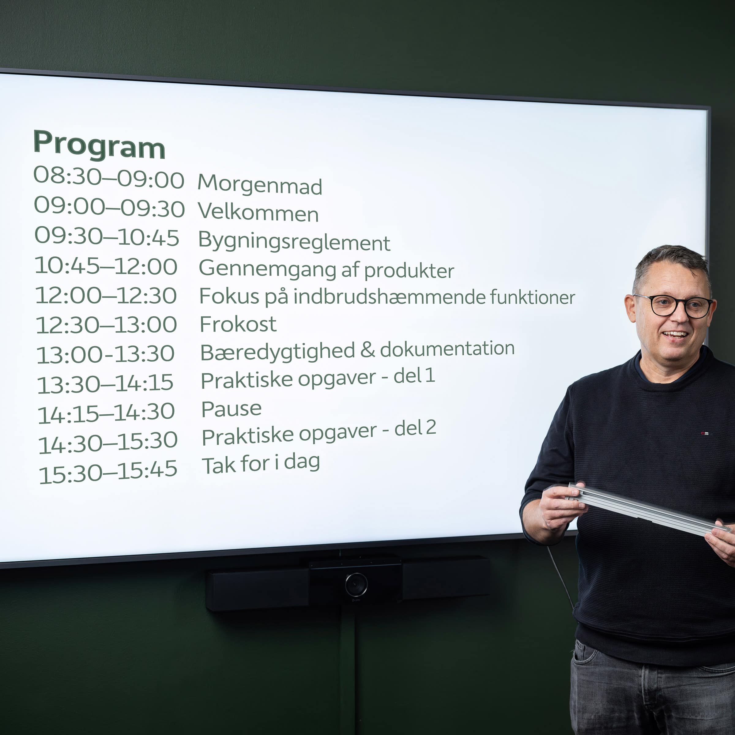 Underviser på Rationels en-dags Vinduesskole er Thomas W. Hansen, der med mange års erfaring i vinduesbranchen og som undervisning er garant for du bliver godt klædt på til at rådgive om facadevinduer og døre i din hverdag med dine kunder.